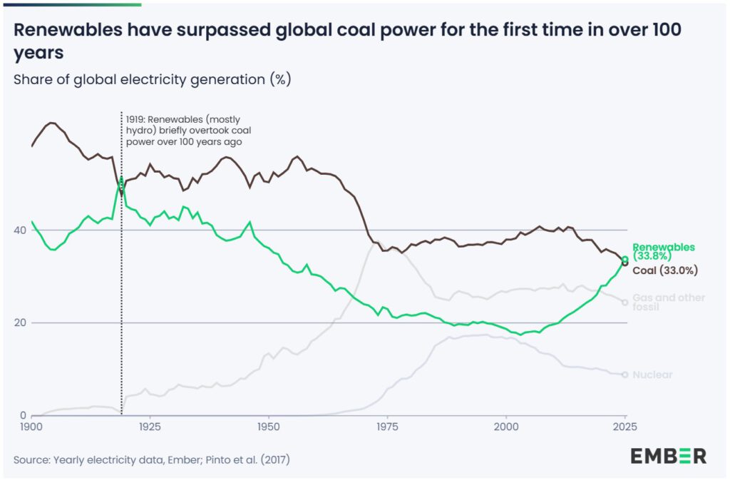 Anders ausgedrückt: „Zum ersten Mal in 100 Jahren haben die Erneuerbaren Kohle überholt“ – weltweit und in atemberaubenden Tempo.