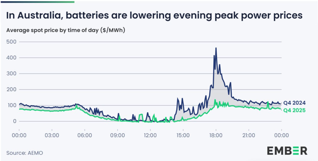 Solarstrom inkl. Batteriespeicher ist heute günstiger als Erdgas. Australien geht hier mit großen Schritten voran und rüstet PV-Strom und Batterien gleichermaßen auf. Gerade in den sonst teuren Abendstunden drückt der Batteriestrom heute die Preise nach unten. Die Veränderung im Börsenstrompreis von Australien zeigt, was Jahr Ausbau Speicherausbau leisten kann…