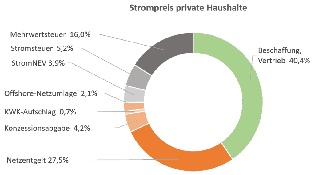 Das macht rund 40,4% für deinen Stromanbieter, 34,5% für die Stromnetze, 21,2% für Vater Staat und 3,9% als Sonderförderung für unsere Industrie.