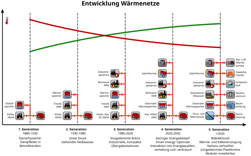 Diese Netze der 5. Generation gehen noch einen Schritt weiter. Hier liegen die Temperaturen zwischen 5°C und 20°C. Am Zielort werden diese per Wärmepumpe auf das gewünschte Niveau angehoben. Diese Technik ist noch sehr neu und Netze der 5. Generation sind bisher die Ausnahme.