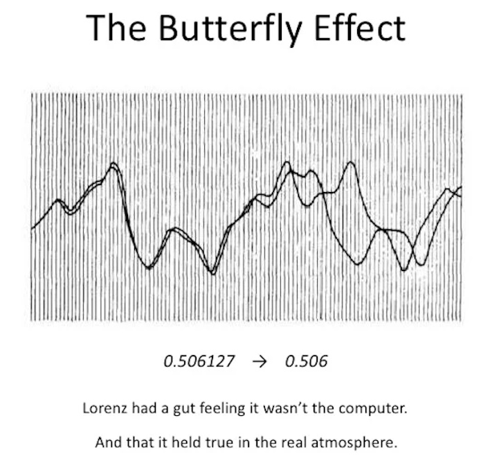 Das war die Geburtsstunde der Chaos-Theorie und des Schmetterlingseffekts. Konkret besagt dieser: Minimalste Änderungen der Luftströmungen an einer Stelle können langfristig riesige Auswirkungen auf das Wetter haben am anderen Ende der Welt. Für die Berechnung einer langfristigen exakten Wettervorhersage musst du jeden einzelnen Schlag eines Schmetterlingsflügels berücksichtigen.