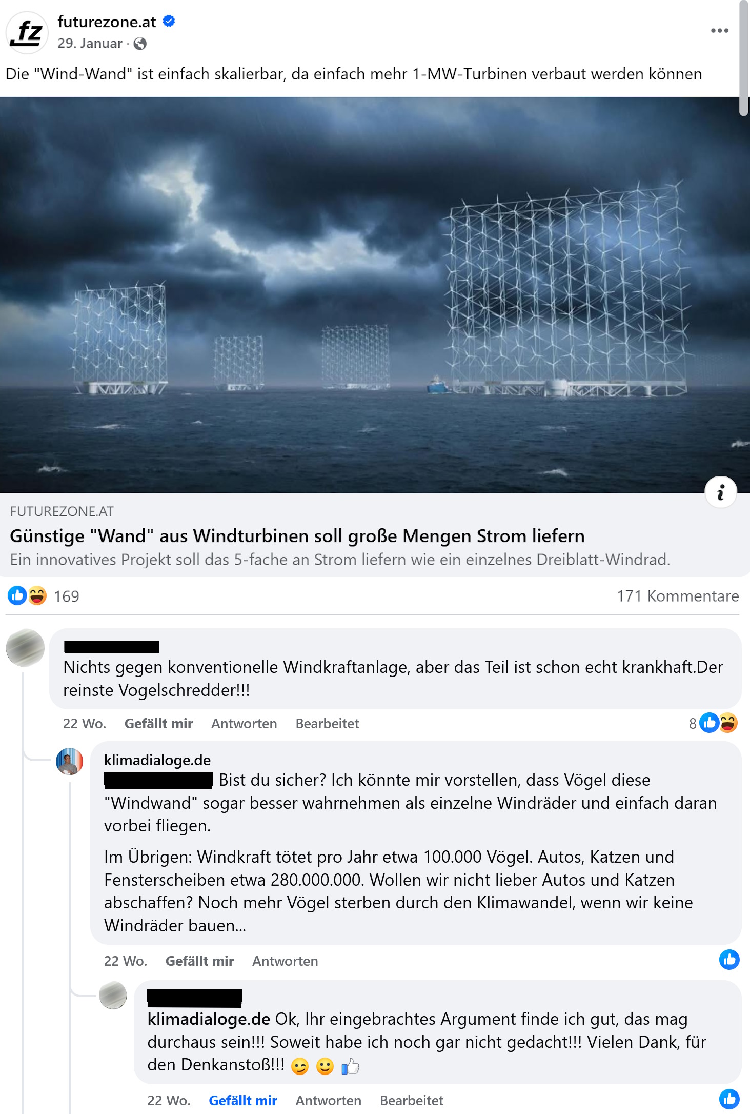 Jeden Sonntag teile ich ein Puzzleteil, wie wir der Klimakrise begegnen und wie die Transformation zur Klimaneutralität gelingt. Dazwischen führe ich viele spannende Diskussionen auf Social Media, insbesondere Facebook (folgen, folgen, folgen, gerne auch auf allen anderen Plattformen). Dort findet man – mit etwas Geduld – auch Fachleute und wertvolle Informationen. Entgegen aller Gerüchte ist auf Social Media auch ein konstruktiver Austausch und Diskurs möglich. Mein Lieblingsbeispiel stammt aus einer Diskussion über ein neues Setup von Windturbinen.