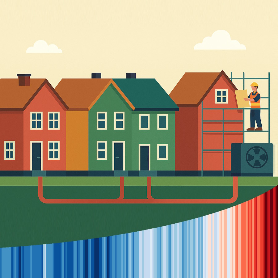 Wärmepumpen funktionieren im Prinzip überall. Doch nicht immer ist die eigene Wärmepumpe die effizienteste Möglichkeit. Bei kleinen Reihenhäusern können einzelne Wärmepumpen vor jedem Haus unnötig teuer sein. Warum nicht gemeinsam eine größere Wärmepumpe nutzen, die alle Häuser der Reihe auf einmal versorgt? So teilt man sich die Kosten für Pumpe, Außeneinheit, Warmwasserspeicher, Pufferspeicher, etc. Auch kann die Gemeinschaftspumpe effizienter arbeiten, weil sich der Wärmebedarf gleichmäßiger verteilt. Während im Haus A heiß geduscht wird, ist Haus B schon auf der Arbeit und hat die Heizung gedrosselt. Auch kann die größere Pumpe vielleicht bessere Wärmequellen anzapfen, z.B. das Grundwasser durch eine Erdsonde, den Fluss vor Ort oder die Abwärme aus einem nahe gelegenen Industriebetrieb.